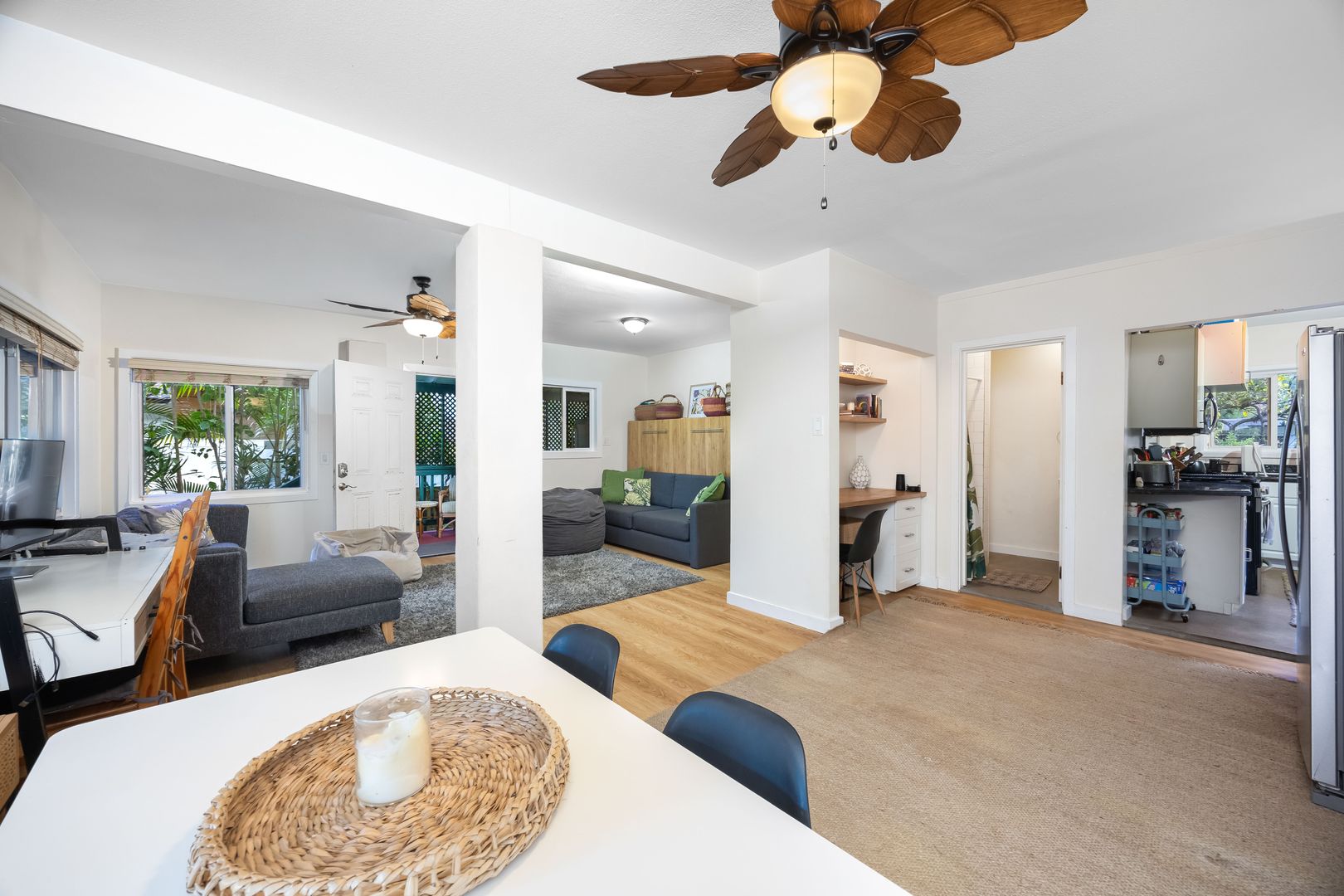 The fully stocked kitchen is thoughtfully equipped with two refrigerators—perfect for longer stays or entertaining. Step outside to enjoy the outdoor lanai, rinse off in your private outdoor shower after a beach session, and unwind in a setting that truly embraces the island lifestyle.
