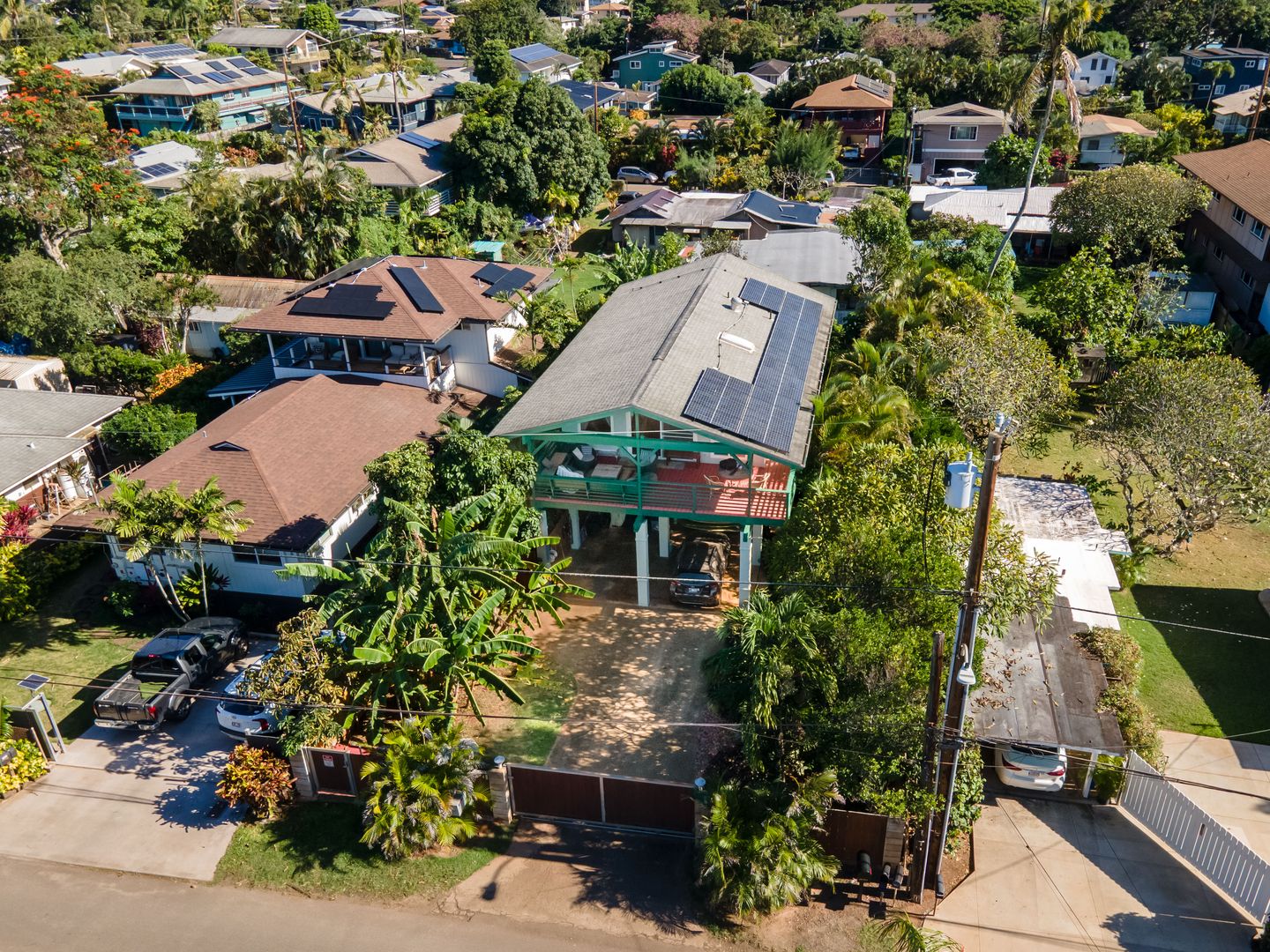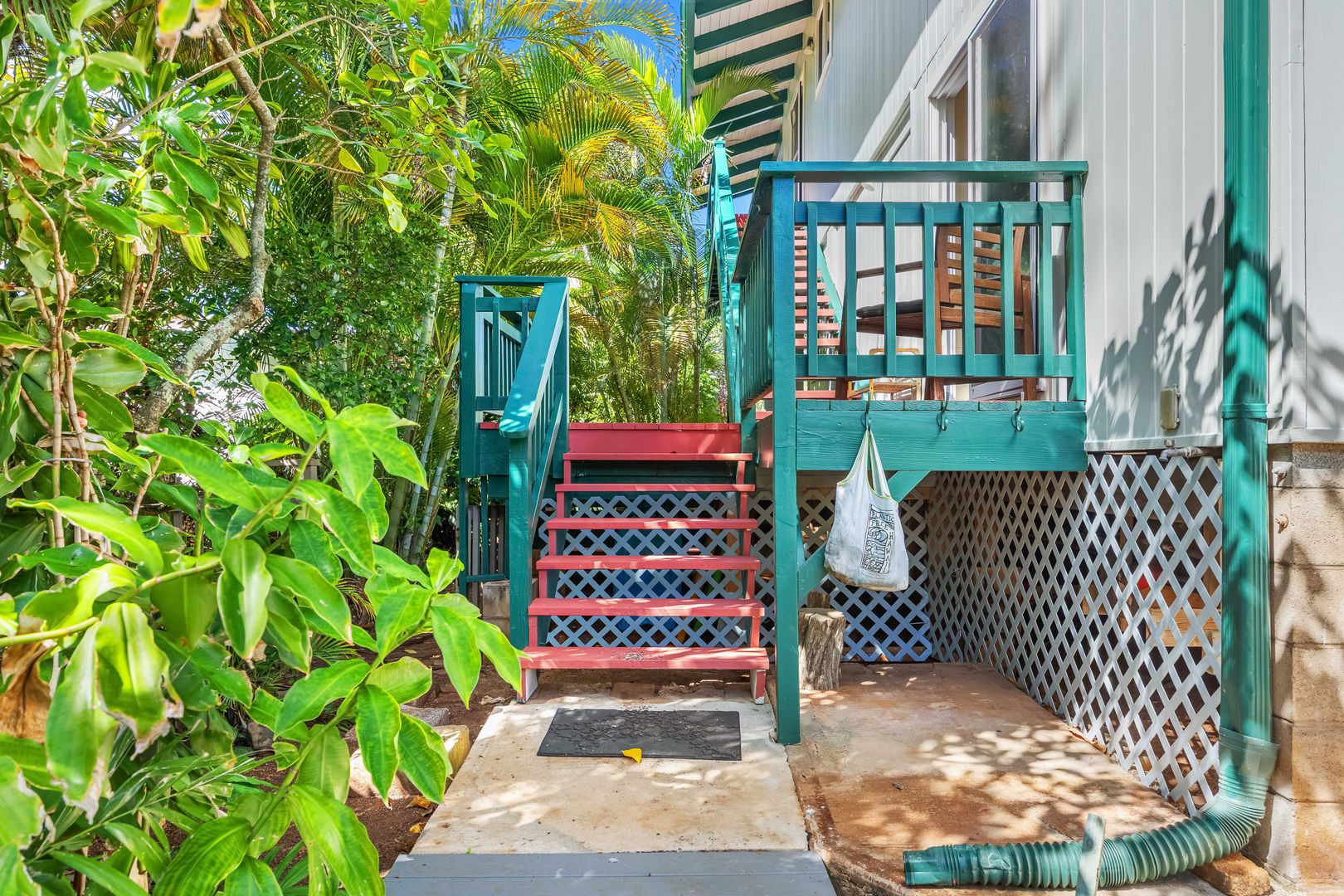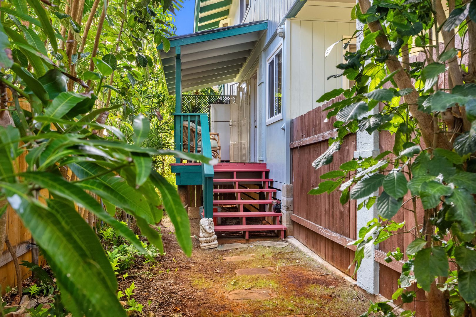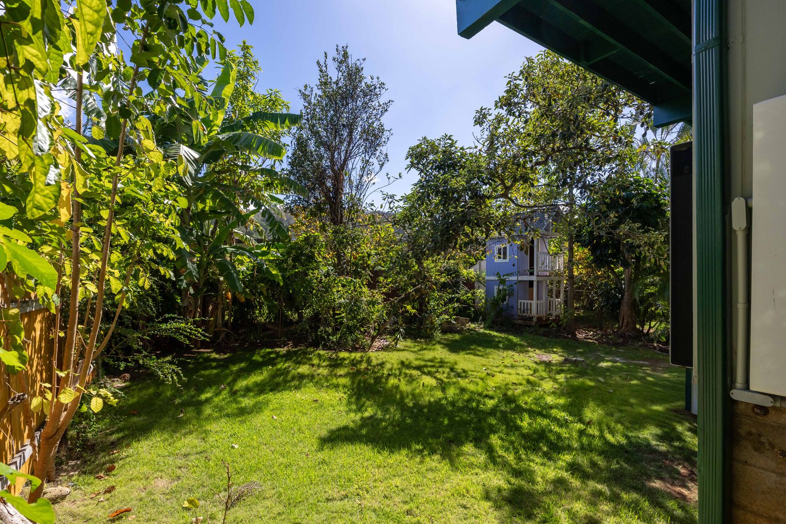 Enjoy a front lanai with seating, a refreshing outdoor shower, and access to a large backyard filled with mature fruit trees—including a huge avocado tree and banana trees. There’s also a two-story kids’ playhouse that’s a dream come true.
