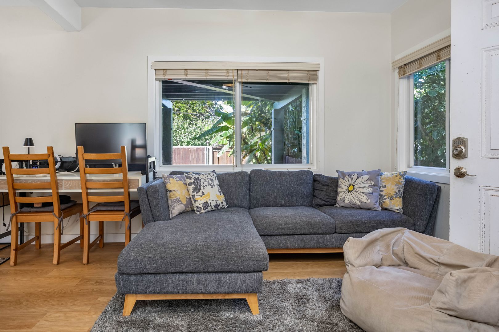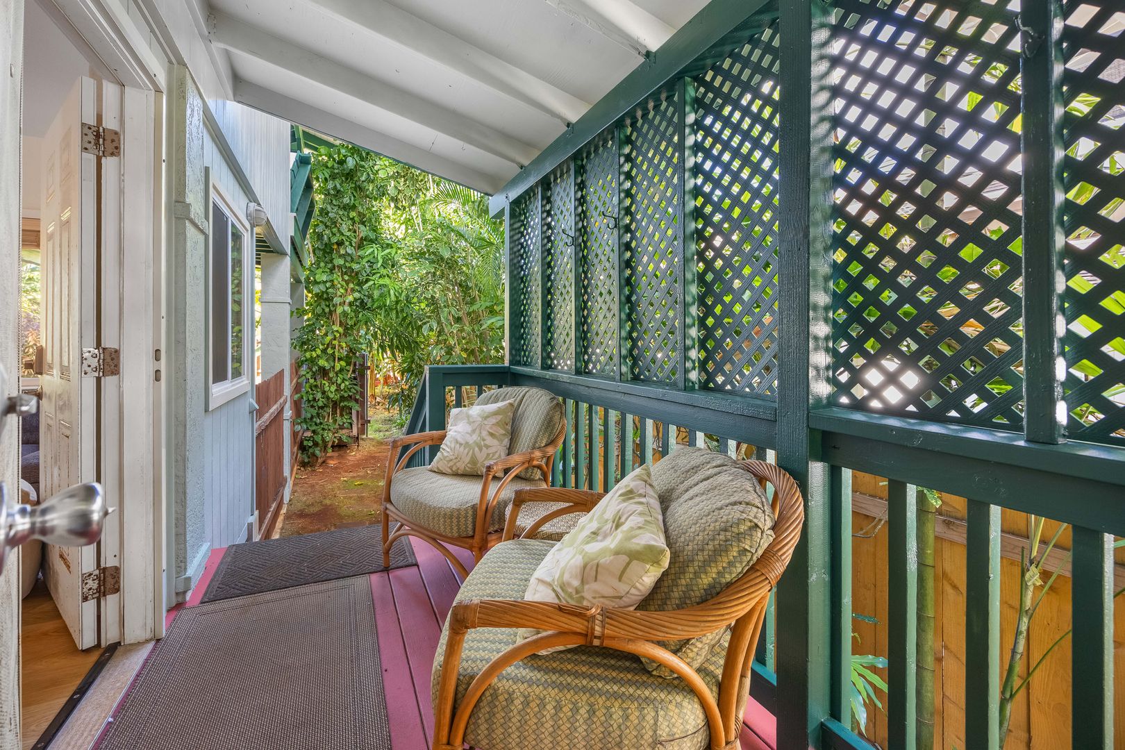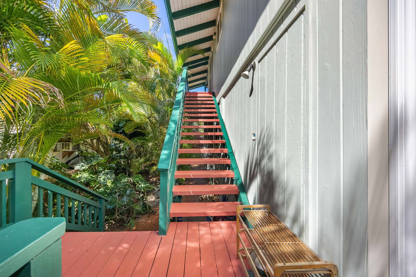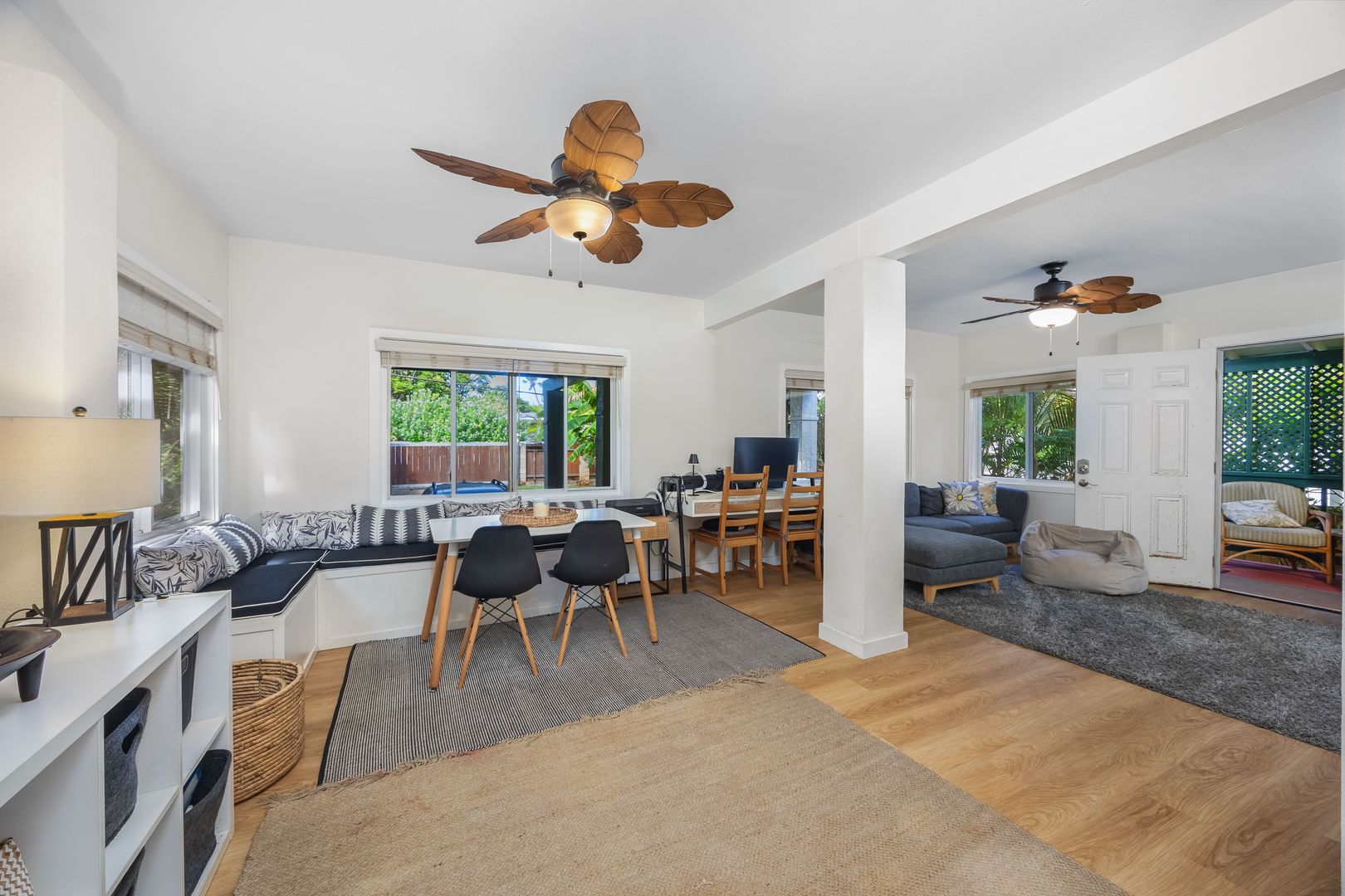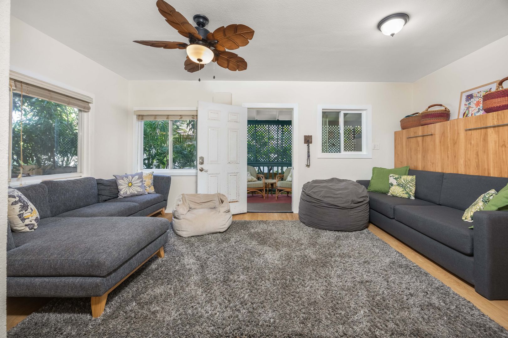 Enjoy a front lanai with seating, a refreshing outdoor shower, and access to a large backyard filled with mature fruit trees—including a huge avocado tree and banana trees. There’s also a two-story kids’ playhouse that’s a dream come true.
