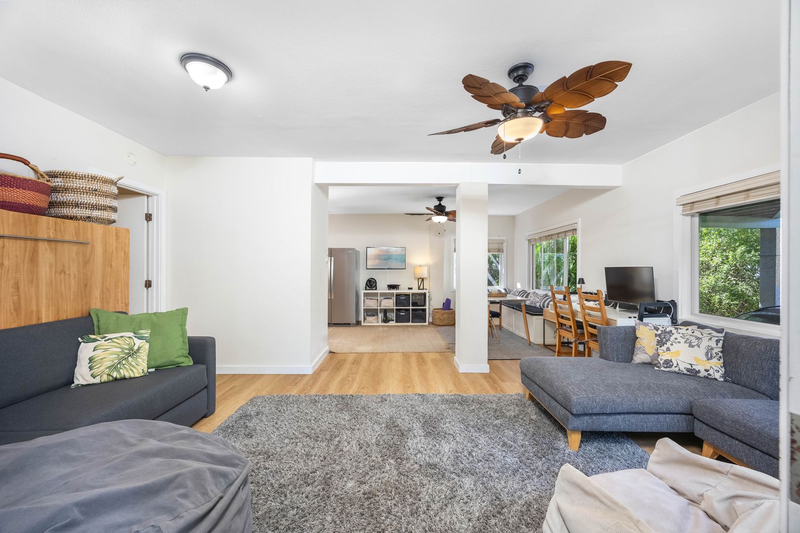 The living room features a queen Murphy bed, comfortable couches, and an office area with two separate desk workspaces—perfect for remote work.