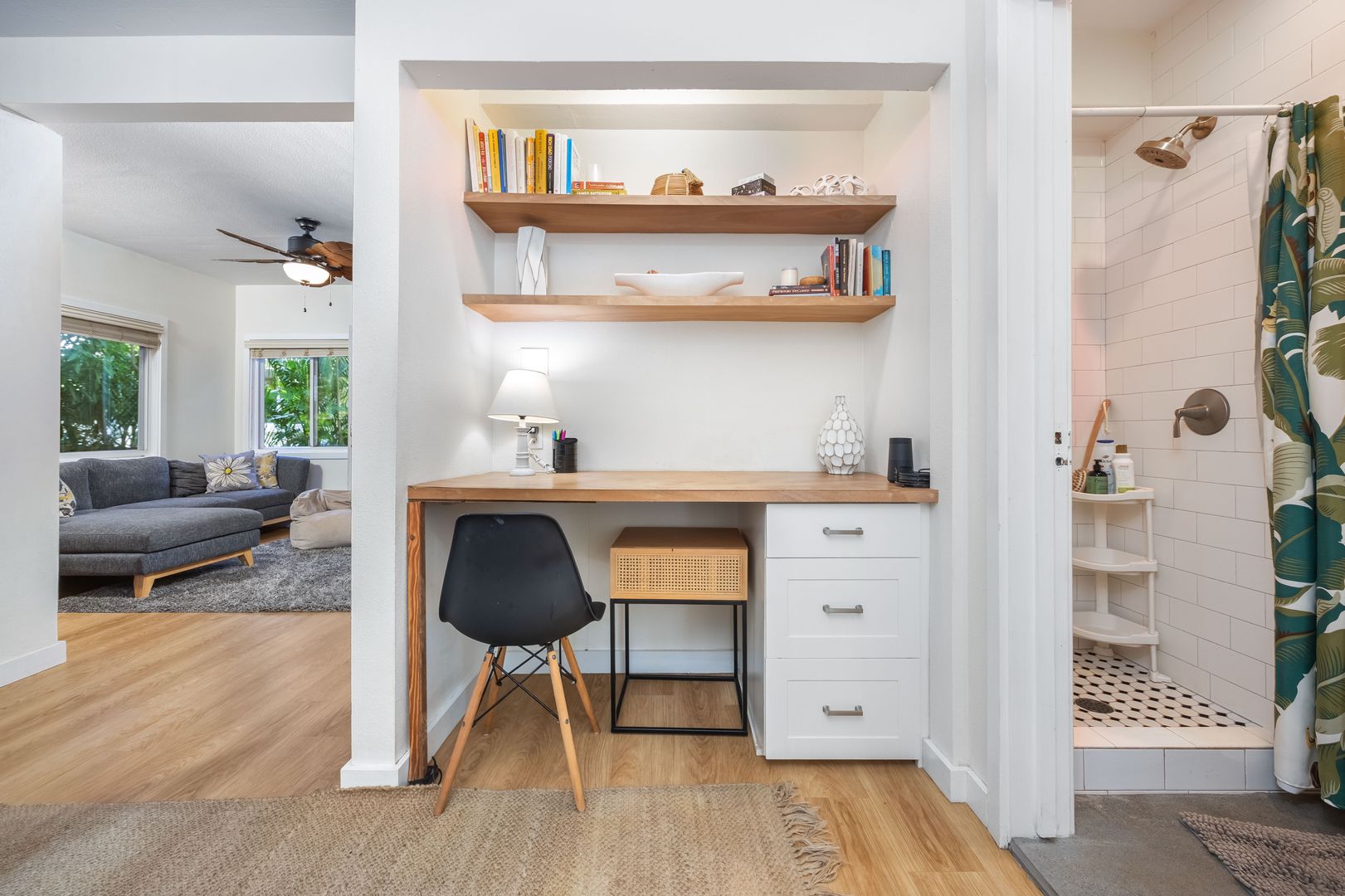 Designed for short-term stays of 1–3 months, this spacious 1-bedroom, 2-bathroom rental is ideal for anyone seeking an immersive North Shore experience. The primary bedroom features an ensuite bathroom and a calm, comfortable retreat. Two dedicated desk areas provide excellent work-from-home flexibility, while a queen Murphy bed in the living room allows for additional guests.