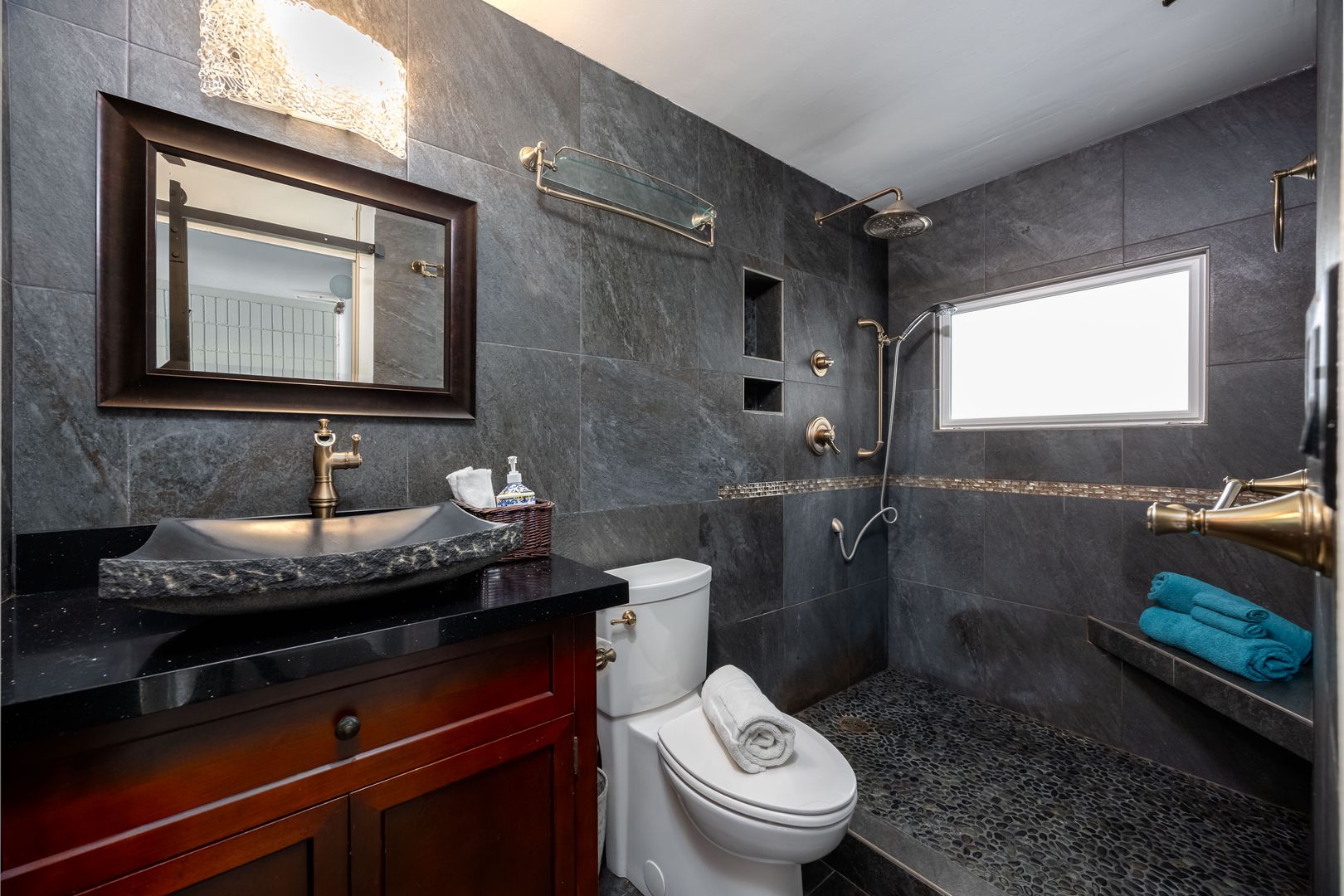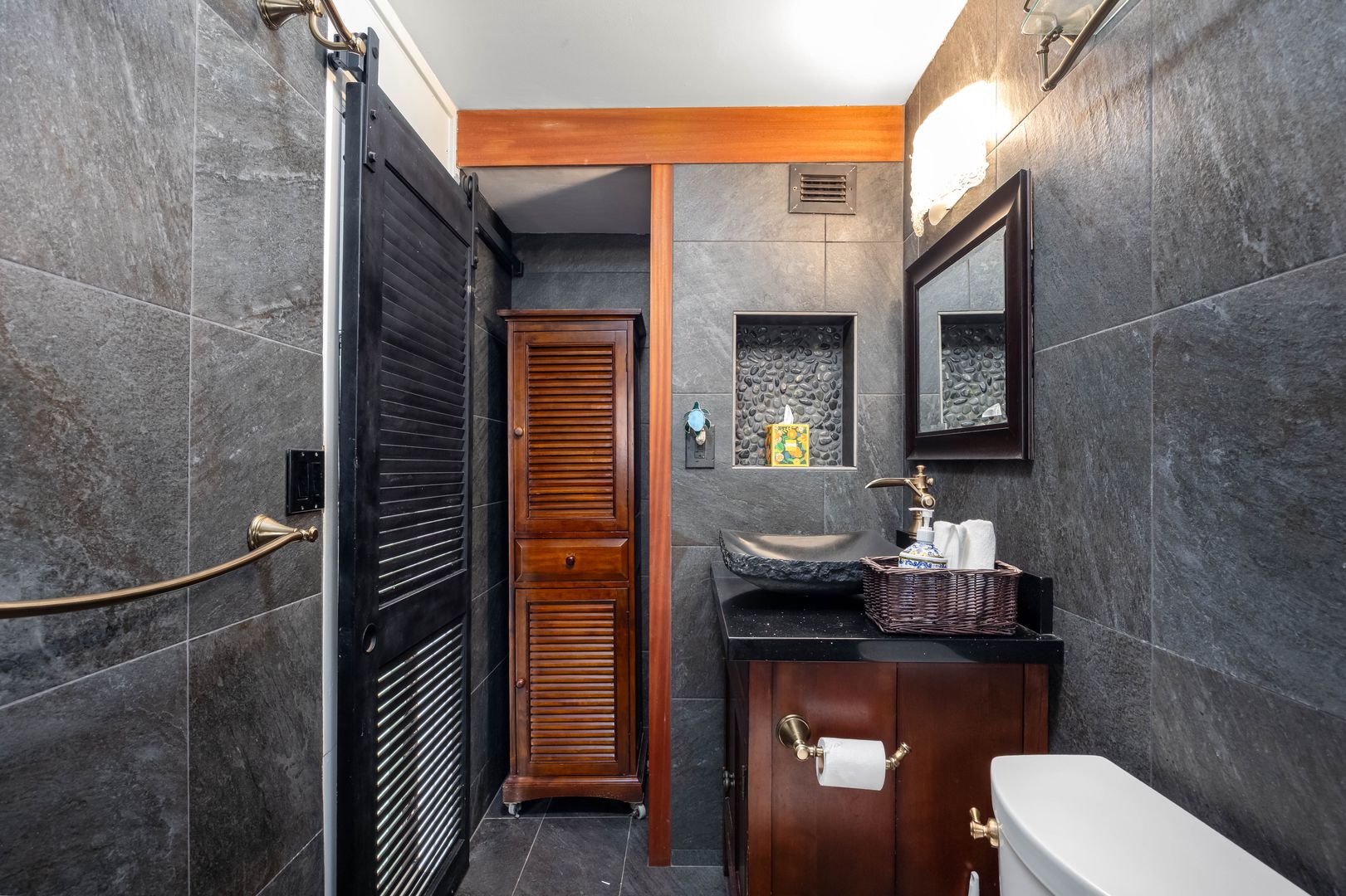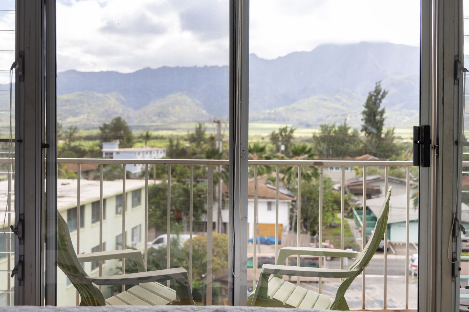 The bedroom offers a tranquil retreat with its own lanai, filled with natural light and framed by stunning views of Mount Kaʻala. The open kitchen is ideal for laid-back island living or entertaining, flowing seamlessly into the main living area.