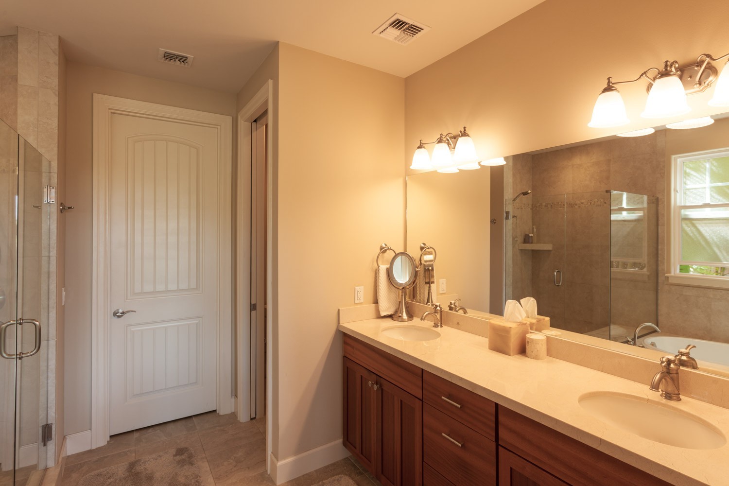 There are 12’ 6 “ ceilings in living area, gourmet kitchen, granite countertops in kitchen and bath areas , jetted tub in master bedroom ,as well as walk in closet. Open concept encompasses