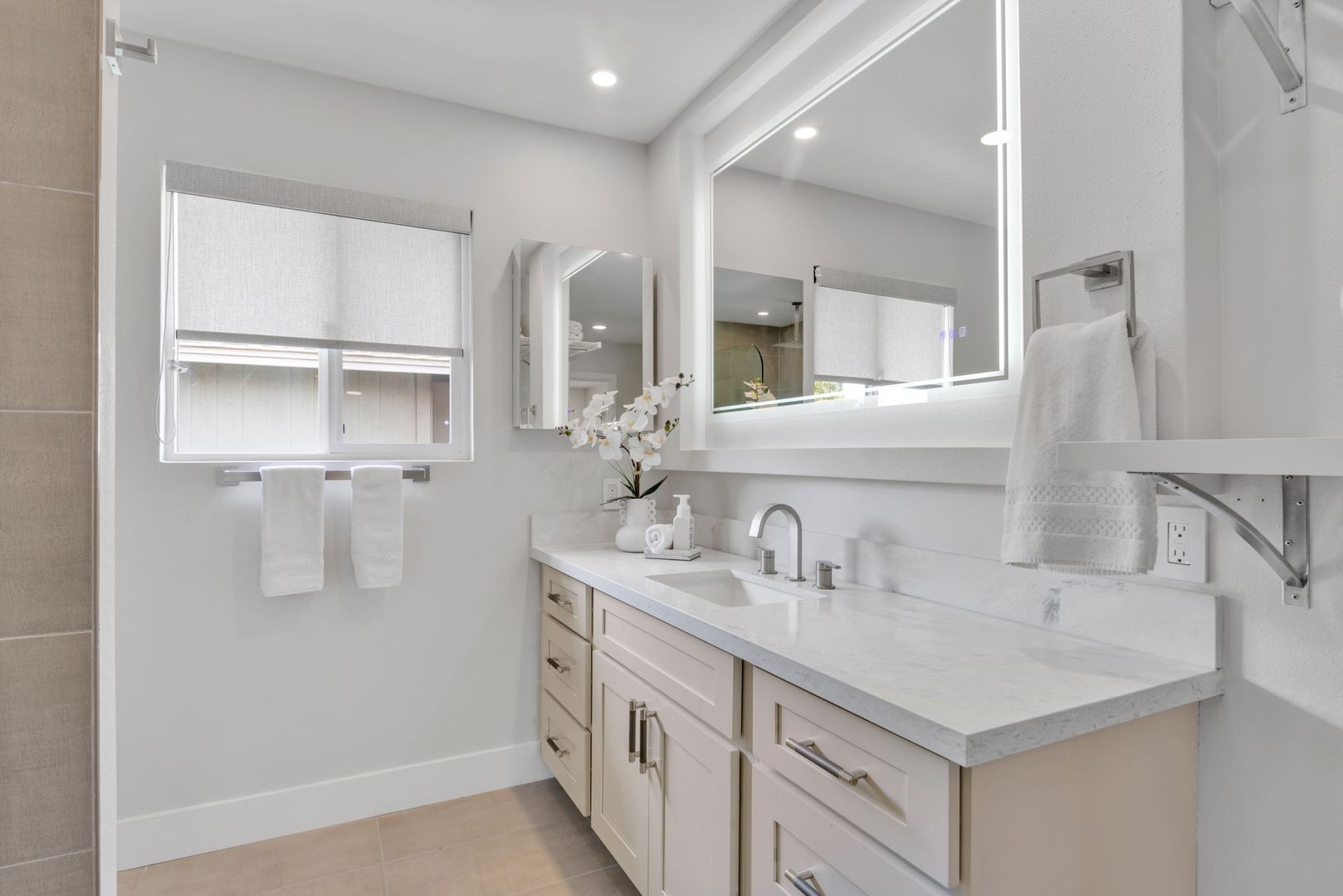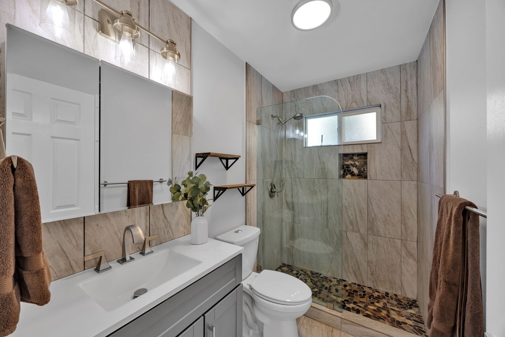 Upper Level: The main level boasts an open-concept living space seamlessly blending the kitchen and living areas. It includes a full guest bath and a spacious primary en-suite. The primary suite offers a custom, spa-inspired bathroom with an oversized walk-in shower and a massive walk-in closet. The room opens onto a large upper deck overlooking the pool and neighboring orchards with mountain views.