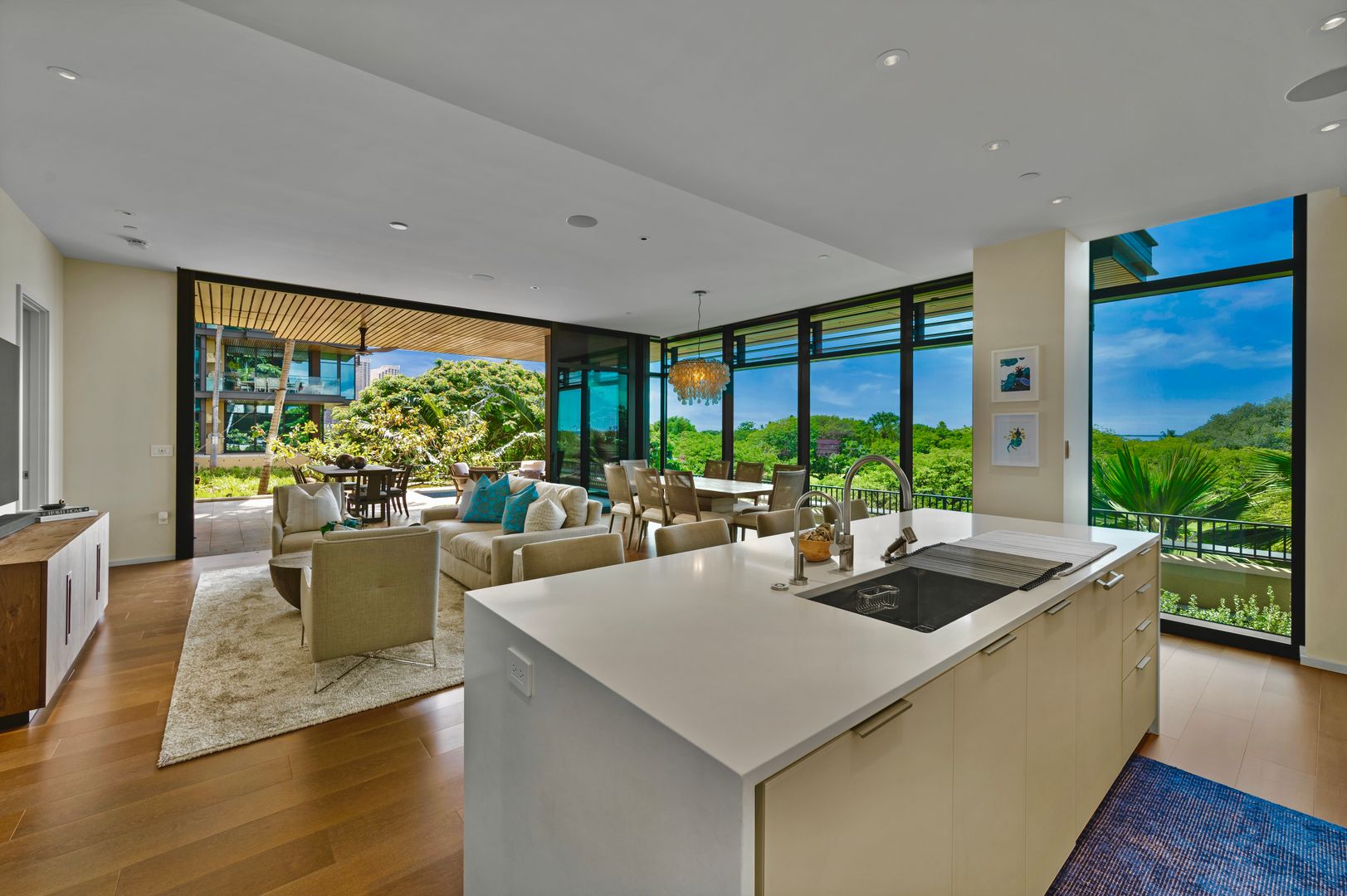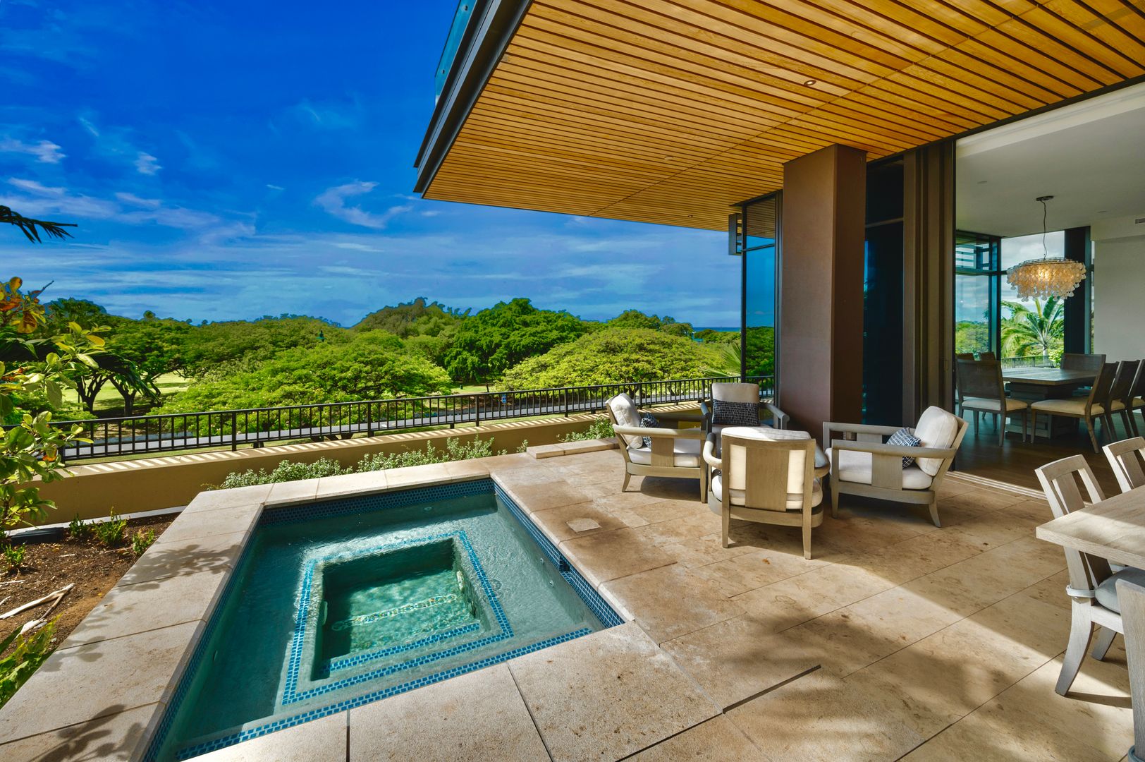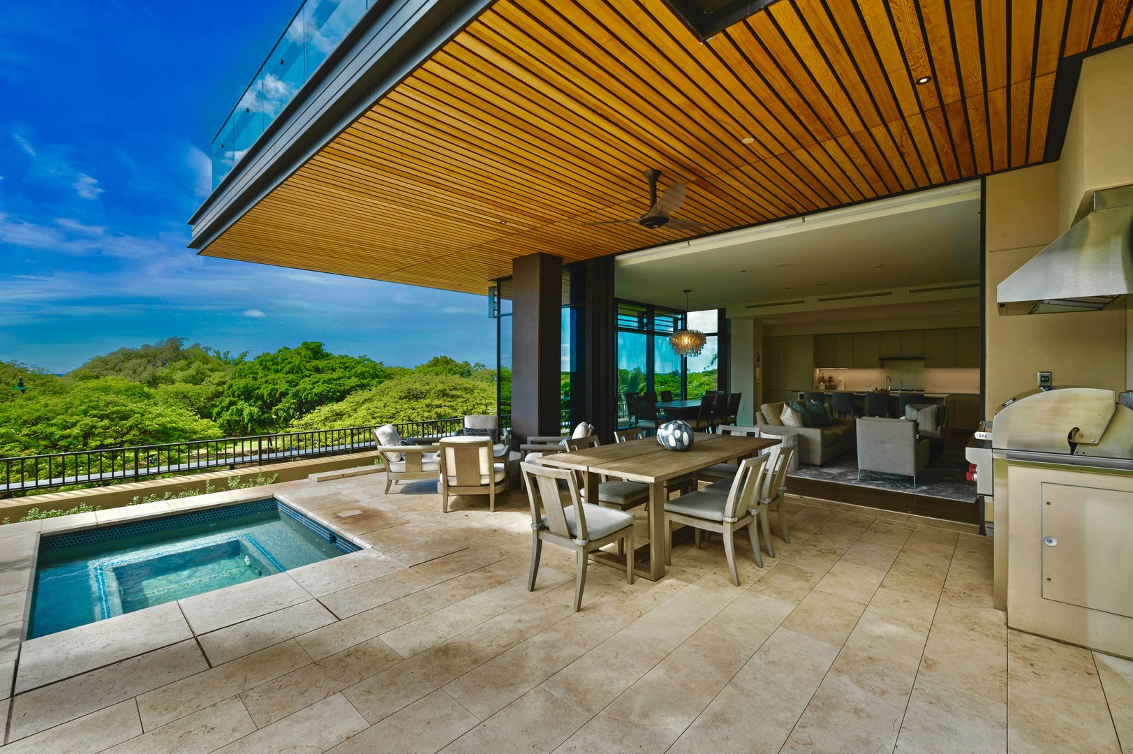 You will love this indoor-outdoor living concept that creates a natural extension between the interior of the home and outdoor space. Complete with private hot tub, lounge seating, dining area, and ceiling fan the lanai also features a built-in Wolf BBQ. An open-floor plan invites you inside and offers a seamless transition between spaces. Although Oahu’s cooling trade winds flow effortlessly throughout the home, central air conditioning are also provided for your extra comfort. Floor to ceiling windows display lovely views from the main living spaces and provide an abundance of natural light that highlights a sophisticated, minimalist color palette. Relax in style in the comfortable living area designed with cozy furnishings and television, or indulge with an island-style meal at home from your spacious dining area. The fully-equipped gourmet kitchen has everything you need for chef-style cooking at home. Including Studio Becker cabinets, Subzero refrigerator, and Wolf appliances - gas range stove, double ovens, and dishwasher. Featuring two bedrooms, plus a den with sleeper sofa, this home can comfortably sleep five people. The master bedroom provides a king size bed, spacious ensuite, and walk-in closet. The second bedroom includes a double size bed with ensuite, large dresser, and thoughtful touches. The final bedroom furnished with two double beds perfect for the little ones or extra guests. The cozy den may be used as an extra sleeping space or office. Sofa in living room can be used as a sleeping space as well!