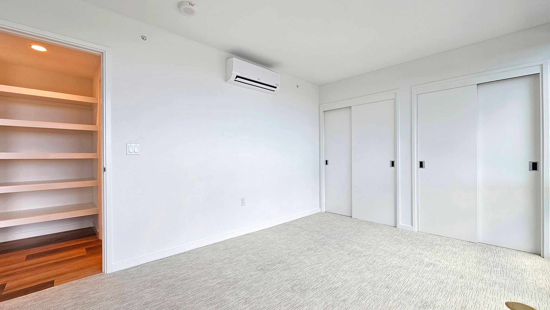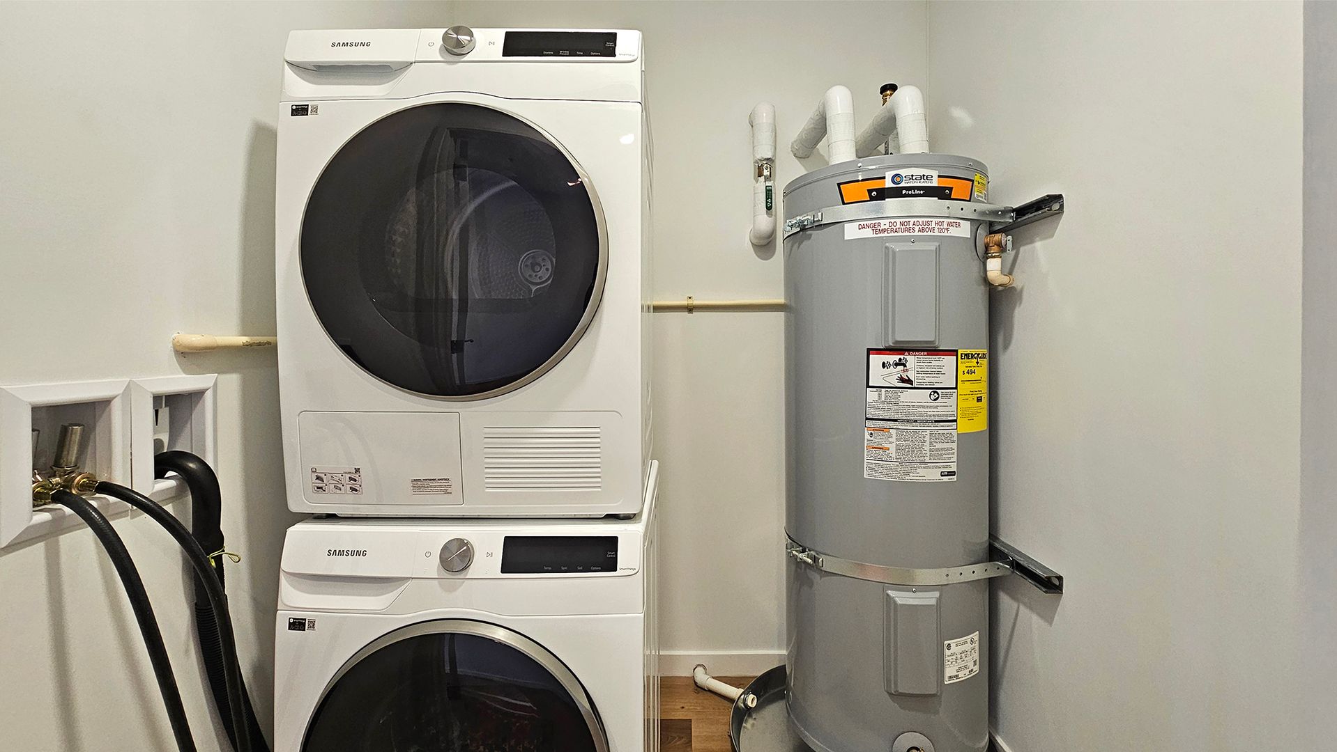 Inside the unit, you'll find modern, stainless-steel Samsung kitchen appliances, including a refrigerator, dishwasher, microwave, range, oven and hood, along with an in-unit full size washer and dryer, and split A/C in both the living room and bedroom.
