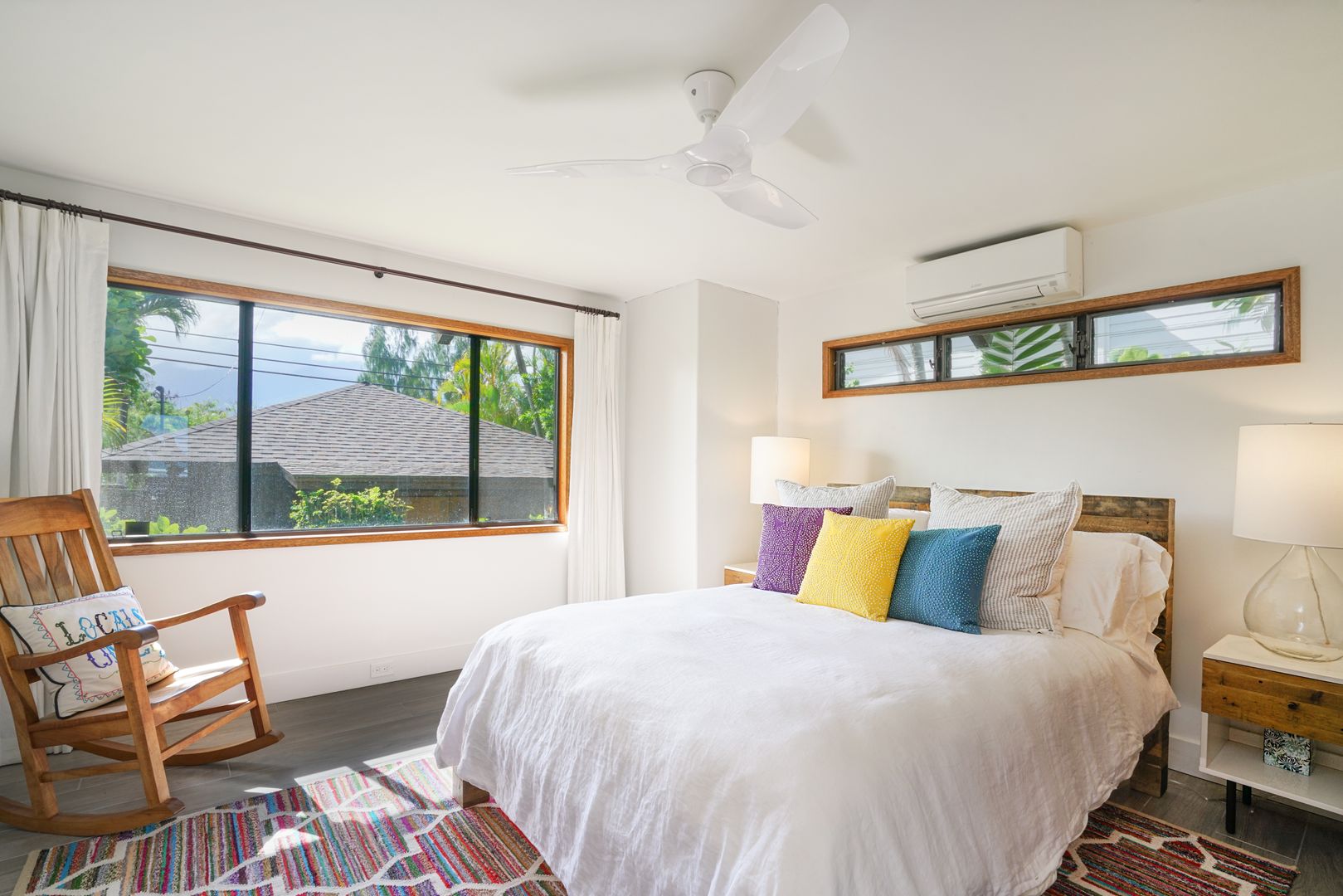 The Guest bedroom has a Queen bed, A/C, and lovely garden views.