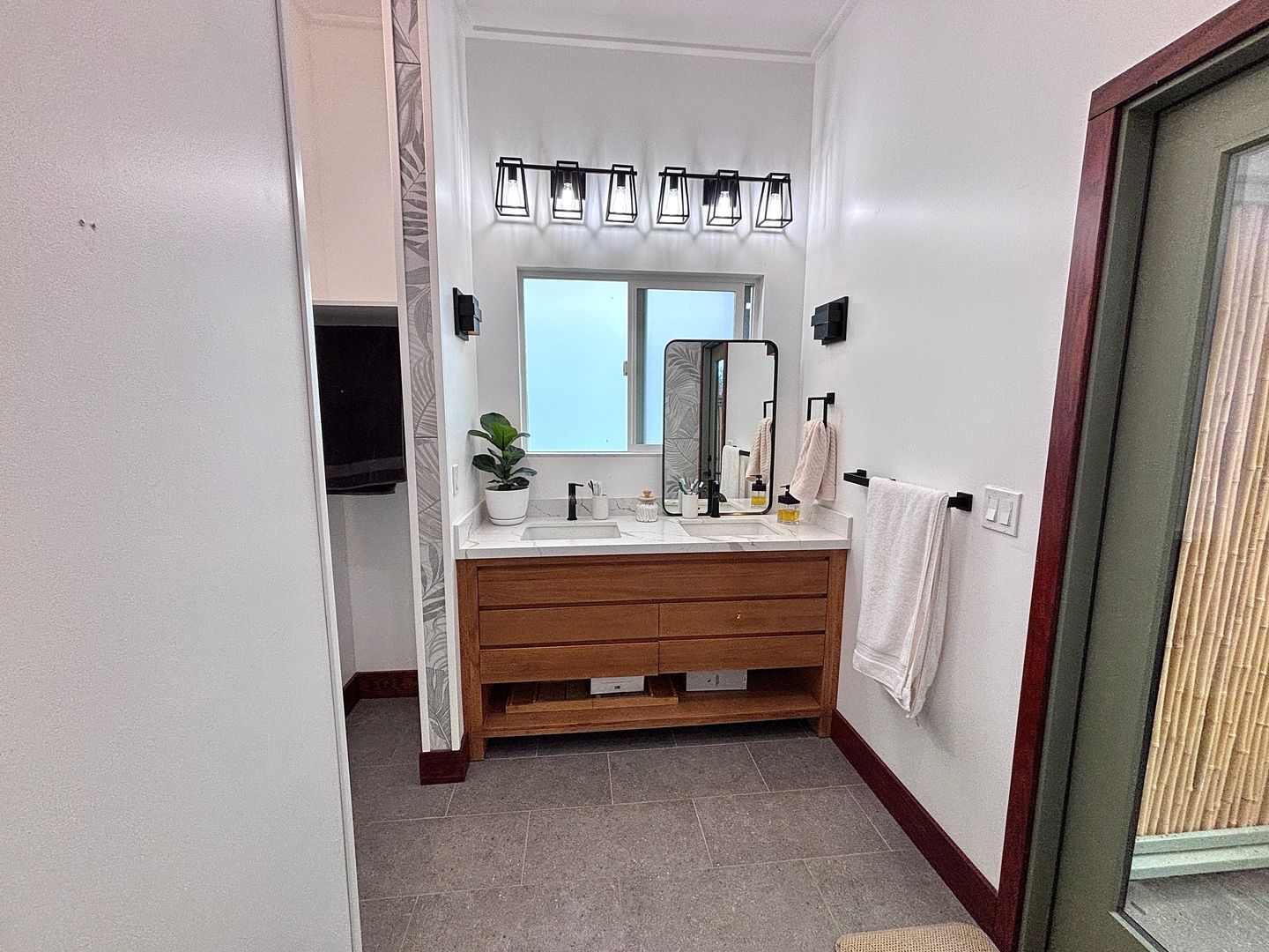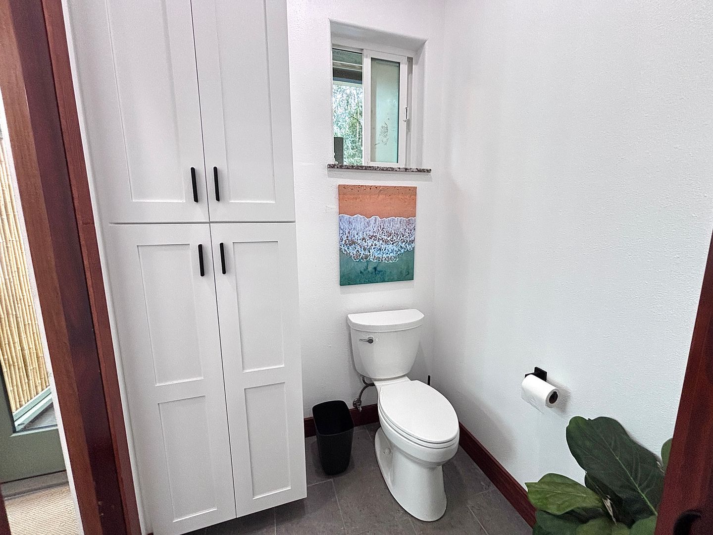 The interior features a stylish mix of **hardwood and polished concrete flooring, providing a clean, contemporary feel. The layout is optimized for storage and functionality: