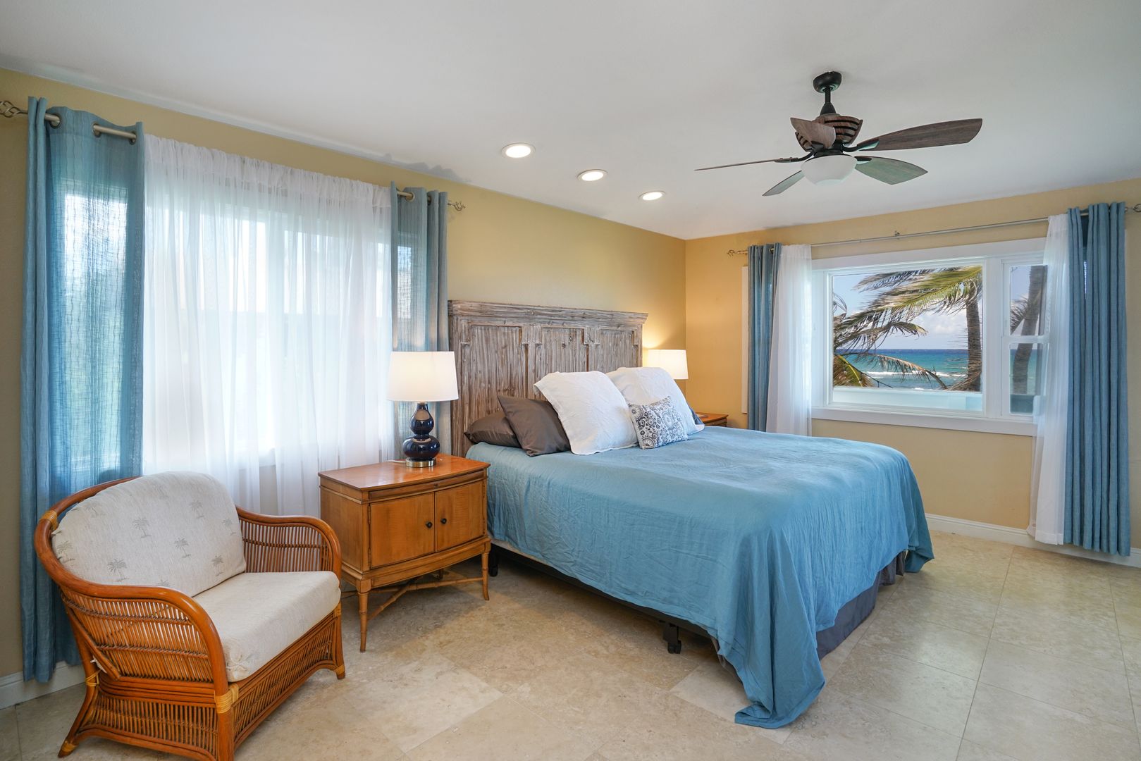 The large master suite is located upstairs, overlooking the ocean, with King Bed, large master bath, walk-in closet, vanity, flat screen TV, foyer entry with seating, and its own private lanai with seating.